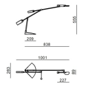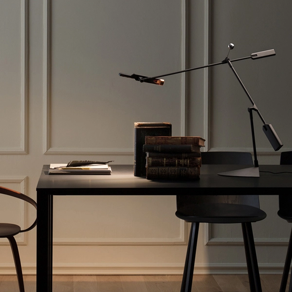 Il corpo e la testa sono in alluminio anodizzato. La base in zama. Disponibile in nero oppure argento anodizzato nelle versioni a 2700K o 3000 K. Base e contrappesi neri.