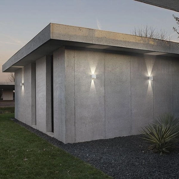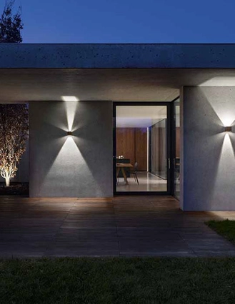 Applique da esterno a biemissione con struttura in alluminio pressofuso, diffusore in vetro trasparente e alette interne regolabili per creare diversi effetti di luce.  Finitura in bianco opaco, nero opaco, grigio antracite, grigio alluminio o marrone. Modulo LED e trasformatore inclusi. Scegli Henk per illuminare con stile i tuoi ambienti esterni!