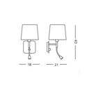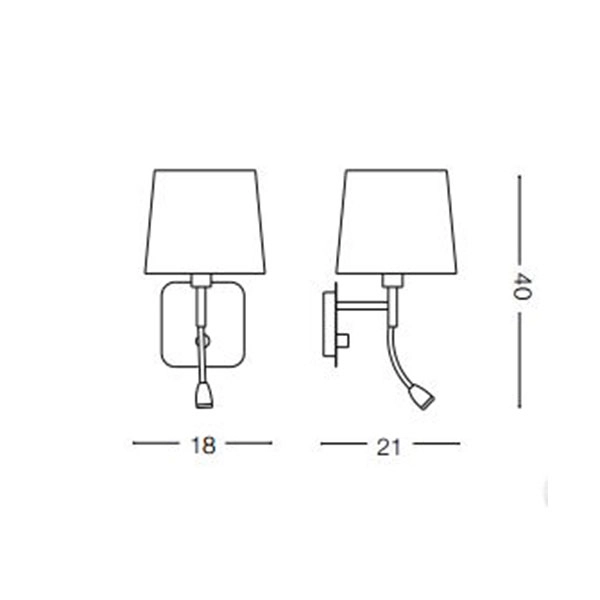 Applique funzionale perfetta per essere posizionata ai lati del letto della camera. Ideale per illuminare anche stanze di alberghi. La montatura è metallo con base in vernice opaca e la struttura è in cromo. Il paralume è in lamina di pvc rivestita in tessuto. Questa applique è dotata di un unico interruttore che ha un controllo indipendente delle due sorgenti luminose.