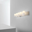 Honey è un'applique a parete che gioca sulla ripetizione, creando due configurazioni lineari a tre o nove moduli. La luce calda è diffusa sia in modo diretto che indiretto e, schermata da diffusori opalini ondulati, dà vita ad affascinanti sfumature. Moduli in policarbonato bianco lucido stampato a iniezione. Circuiti topLED con lenti semisferiche ad ampliare l’apertura del fascio luminoso. Sorgente dimmerabile. Montatura a parete in alluminio verniciato bianco.