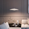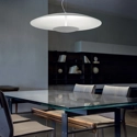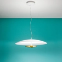Lampada dalle linee contemporeanee di grande impatto scenografico che ricorda un disco volante. Il diffusore bianco espande la luce indiretta e la propaga sul piano senza dispersioni. La montatura è in acciaio verniciato bianco raggrinzante, il diffusore è in vetro serigrafato/sabbiato. Disponibile in tre varianti: bianco, oro e cromo.