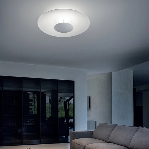 Horizon è una plafoniera moderna dal forte impatto scenografico con un disco volante a luce riflessa e diffusa. Il bianco del diffusore espande la luce indiretta e la propaga sul piano senza dispersioni. Materiali: montatura in acciaio verniciato bianco raggrinzante, diffusore in vetro serigrafato/sabbiato. Disponibile in bianco, oro e cromo.