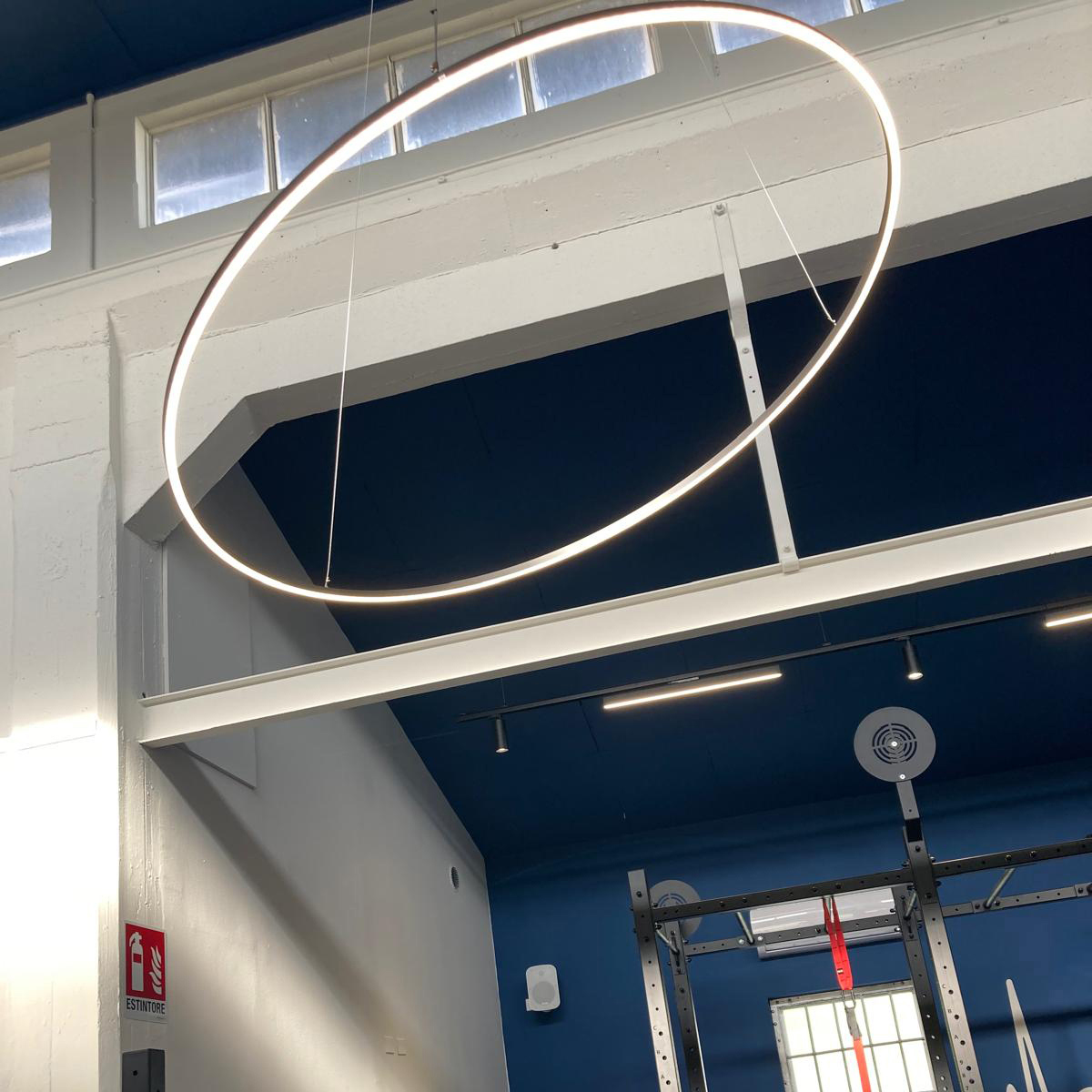 Collocate a soffitto nella zona centrale della sala, le sospensioni a led dal profilo circolare garantiscono un’illuminazione diffusa e uniforme, ideale per accompagnare le diverse attività che si svolgono nell’area.