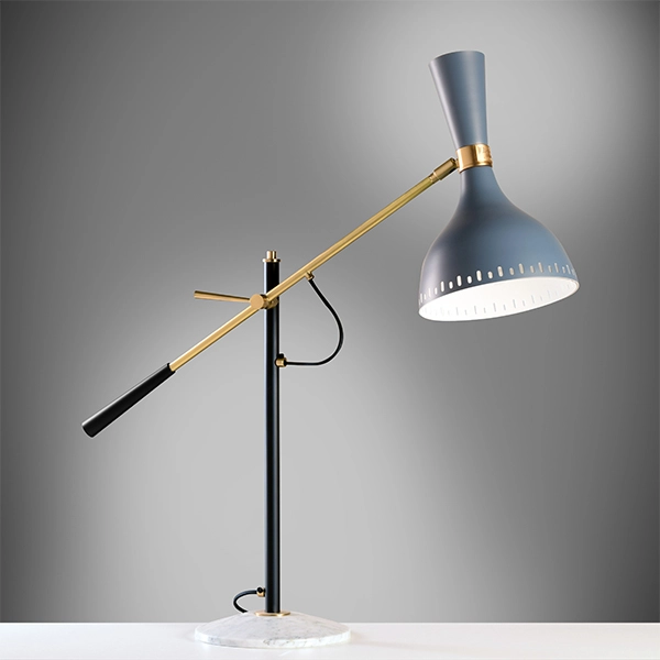 Un richiamo agli anni '60/'70 con Imbuto, lampada da tavolo di design che fa parte di una collezione imperdibile firmata Lampex! Tre versioni e tre stili diversi per illuminare un tavolo, una scrivania o perché no anche un comodino. Il colore è protagonista e il comfort luminoso assicurato. La variante in viola dispone di una struttura in metallo e ottone; la variante in nero goffrato e ottone satinato di una struttura in metallo, ottone e marmo verde Marquinia; mentre la versione in pantone 7476 di una struttura in metallo, ottone e marmo bianco di Carrara.