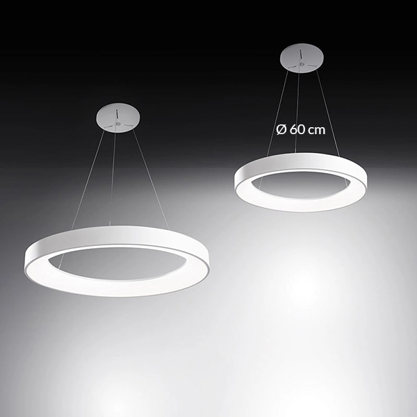 Lampada a sospensione minimal e di design. Un disco di luce che illumina con grande eleganza gli ambienti della casa, di hotel, bar e ristoranti. Disponibile nelle finiture: bianco, sabbia e nero e in due dimensioni. Materiali: alluminio + acrilico. Driver incluso. Grado di protezione IP20.