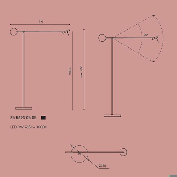 La struttura è in alluminio e acciaio rifiniti in nero opaco, il diffusore è in PMMA sfumato ed è ruotabile fino a 90°.