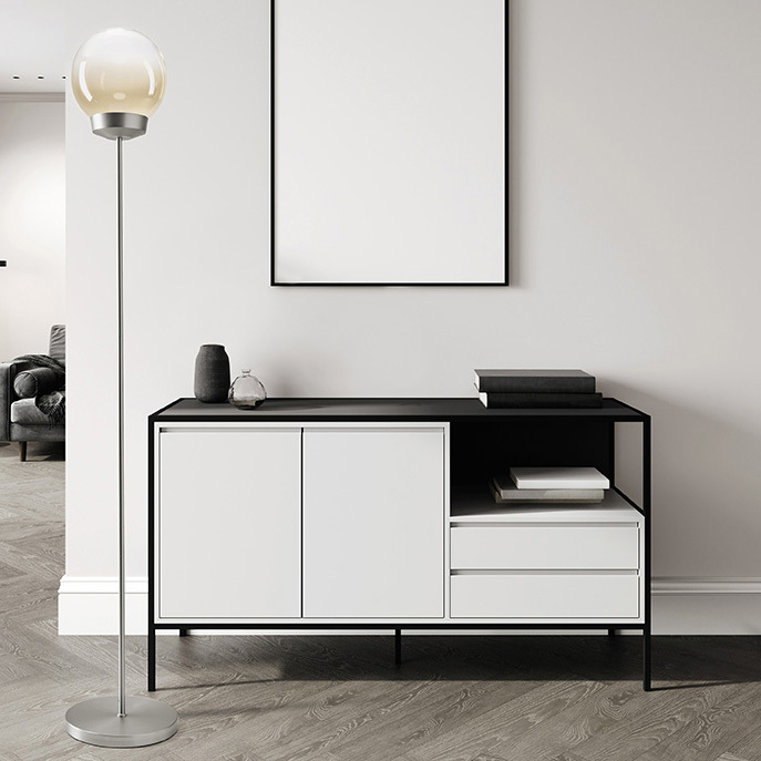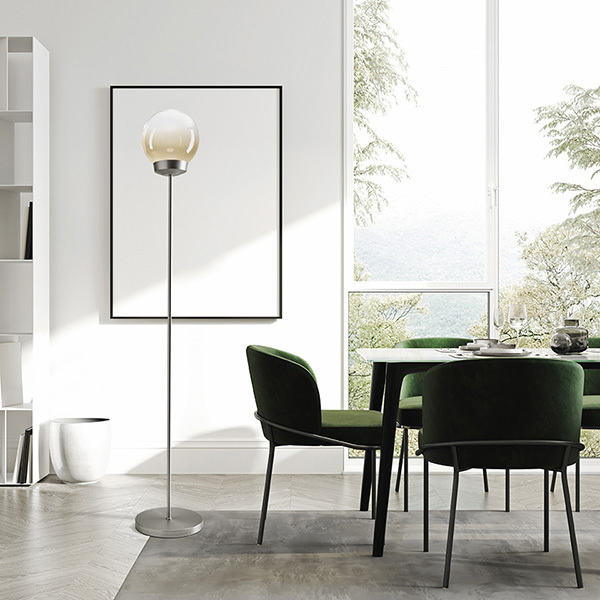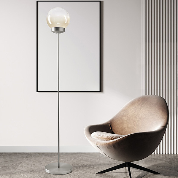 Lampada da terra in metallo spazzolato alluminio, vetro Pirex trasparente con sfumatura ambra diametro 25cm. Dotata di dimmer. Un prodotto moderno che può essere collocato in diversi ambienti, dal soggiorno alla camera da letto.