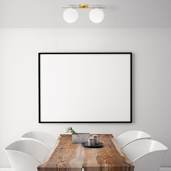 Plafoniera perfetta come soluzione moderna per la zona living della casa. Il design originale è di Davide Negri. La montatura è in ottone spazzolato mentre il corpo luce è realizzato in vetro soffiato bianco latte.