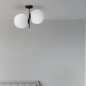 Lampada da soffitto a 2 luci nera perfetta come opzione moderna ed elegante per la zona living e la zona notte della casa. Il design originale è di Davide Negri. La montatura è verniciata nero mentre il corpo luce è realizzato in vetro soffiato bianco latte diametro cm 25.