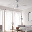 Kai, ventilatore da soffitto extra silenzioso con luce, ideale per illuminare e rinfrescare allo stesso tempo gli ambienti della casa. La struttura è in acciaio, il diffusore in vetro e le pale sono in legno con rifinitura in bianco. Perfetto per uso all'interno, Kai è un elemento d'arredo che combina design e funzionalità.