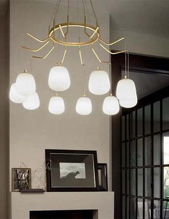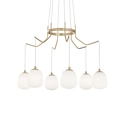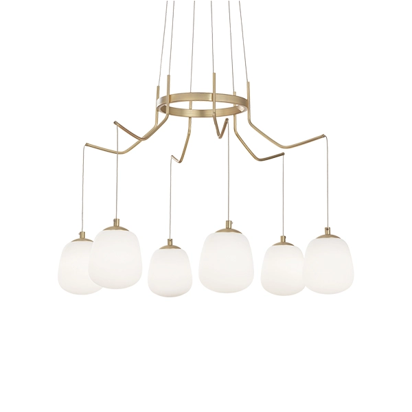 Karousel è un lampadario a 6 luci in ottone satinato di grande impatto visivo. Da scegliere per ambienti spaziosi della casa e soprattutto per le hall degli hotel. I diffusori sono in vetro incamiciato bianco, soffiato e acidato. Lampadine LED G9 3,2 W 3000 K incluse.