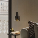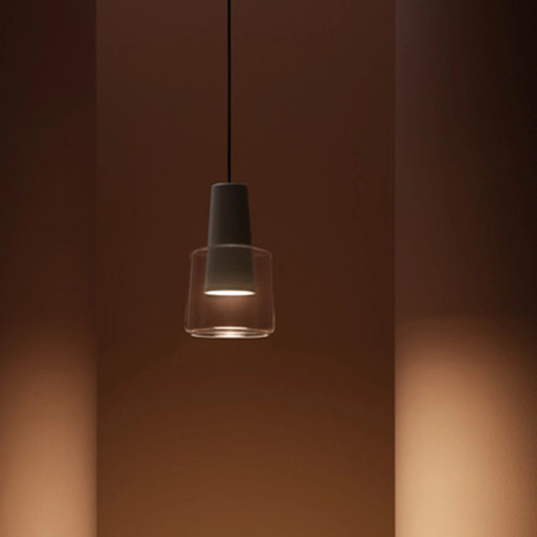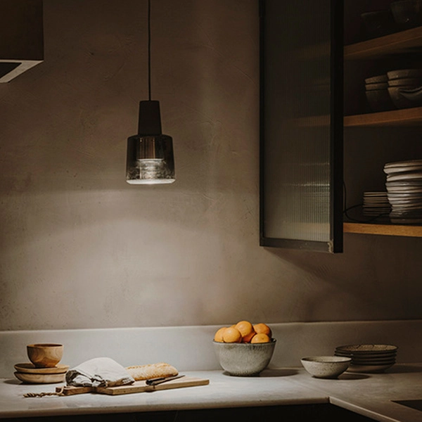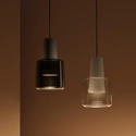 Lampada a sospensione che ricorda lo stile orientale con diffusore in vetro adatta alla zona giorno di abitazioni arredate in stile moderno. Perfetta sopra il tavolo da pranzo o all'isola della cucina, Khoi crea un particolare effetto ottico. La struttura è in alluminio rifinita in grigio cemento o bianco. il diffusore è disponibile in due finiture: fumè o trasparente.