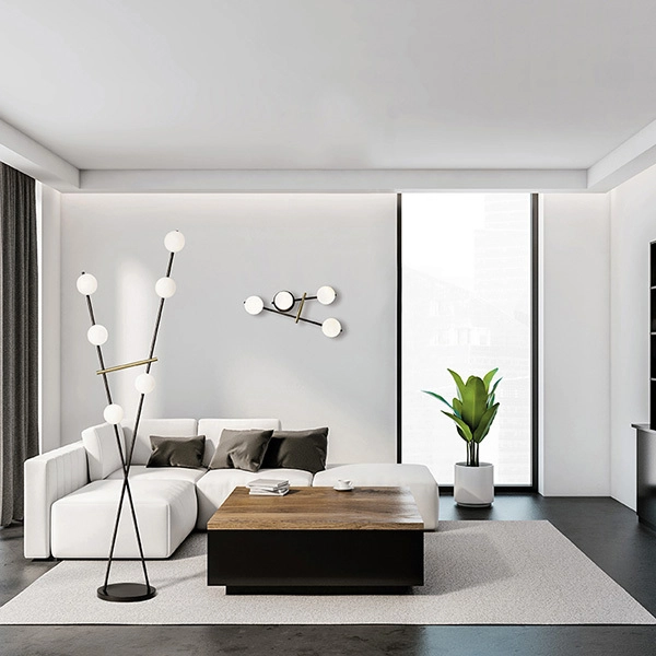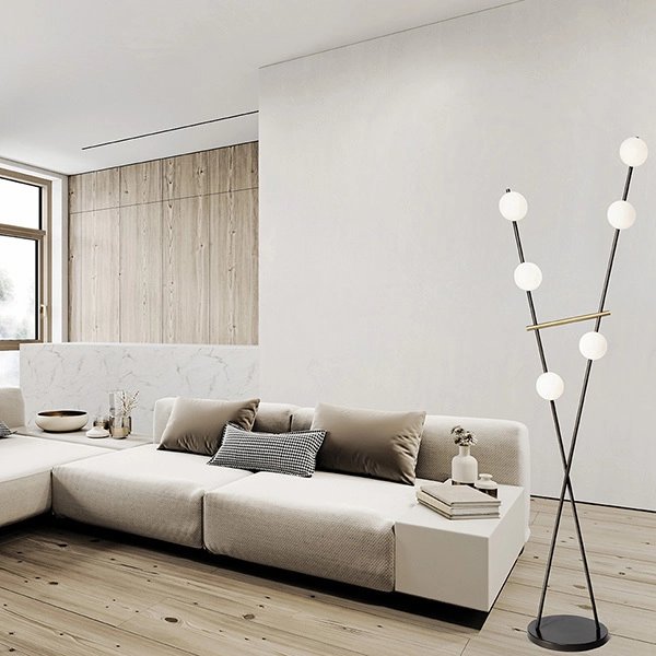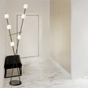 In un angolo del soggiorno o in una hall di un hotel, Kika illumina e arreda. Una piantana di design caratterizzata da 6 sfere luminose. Soluzione di tendenza ad un ottimo rapporto qualità/prezzo. Struttura in metallo, colore liquirizia nera con particolare in oro spazzolato. Vetri soffiati bianco latte. Lampada dotata di Dimmer.