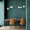 Kika è una lampada a sospensione moderna e di design ideale per illuminare un grande tavolo nella zona giorno della casa. Grazie al suo stile, può essere scelta anche per l'illuminazione di ambienti commerciali. Struttura in metallo, colore liquirizia nera con particolare in oro spazzolato. Vetri soffiati bianco latte.