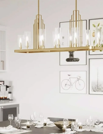 Questa sospensione in stile art déco si caratterizza per forme geometriche e finiture in ottone naturale spazzolato e nichel lucido. I paralumi sono in vetro trasparente scanalato. Le scanalature verticali producono un sottile effetto luminoso, per un'illuminazione più semplice è possibile rimuovere i paralumi.