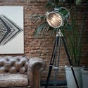 Piantana scenografica ideale per il soggiorno di abitazioni private arredate con stile minimal o industrial. Può essere inserita anche all'interno di hotel o locali pubblici. Il treppiede è in legno verniciato nero opaco e sorregge il diffusore in vetro trasparente dotato di comode alette interne per l'orientamento del flusso luminoso. Il corpo luce e tutti i dettagli sono in metallo cromato.