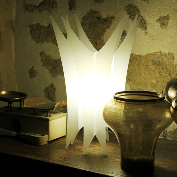 Lampada da tavolo in materiale plastico completamente riciclabile con brevetto interrnazionale bianca.