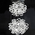 Lampada doppia a sospensione della serie Astro di Metal lux. Vetro pirex disponibile in diverse colorazioni, struttura in acciaio, bracci flessibili in rame lavorato. Finitura disponibile cromo lucido.