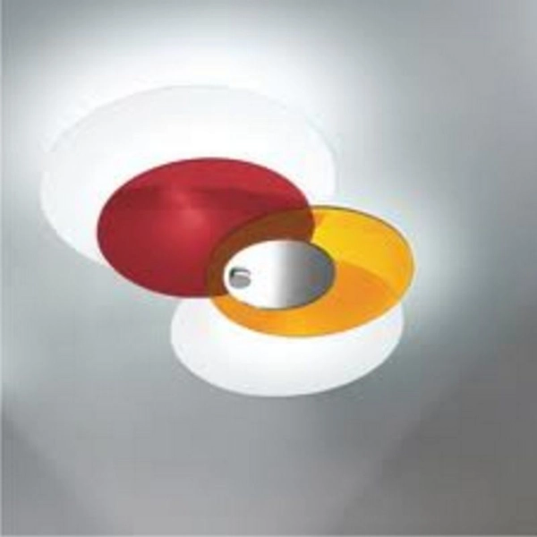 Lampada da soffitto, montatura in metallo verniciato bianco, diffusori in vetro sabbiato e plastica colorata.