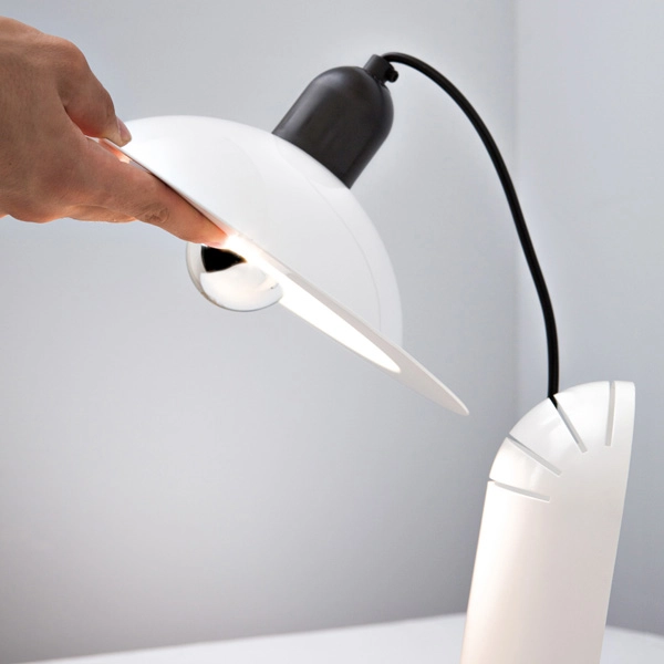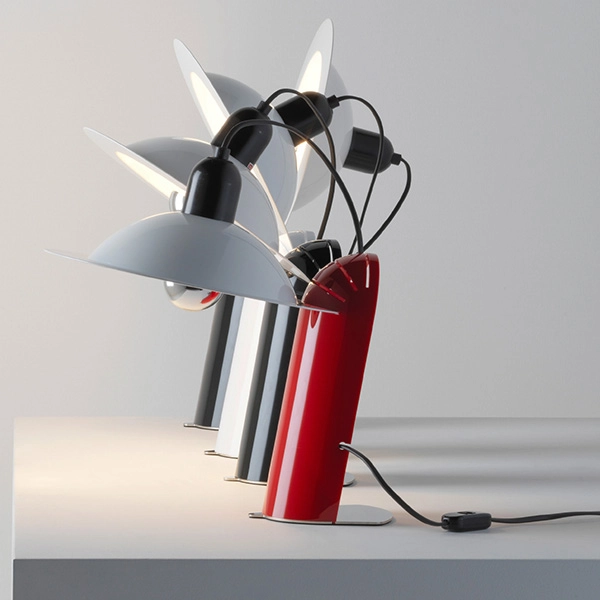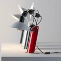 Lampiatta è una lampada da tavolo facilmente riposizionabile senza l’uso di snodi o meccanismi: il paralume è pensato per potersi inserire a piacere in una delle quattro fessure del basamento, consentendo l’inclinazione e l’orientamento della luce. Il corpo è in policarbonato in pasta lucido bianco, nero, rosso. Base d’appoggio in metallo e removibile (per installazione a parete). Parabola in alluminio verniciato bianco. Lampadina LED 7W 2700K E27 cupola argentata inclusa. Togliendo la basetta in acciaio dalla base del corpo, Lampiatta è installabile a parete.