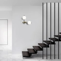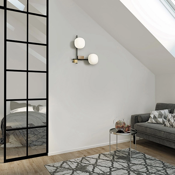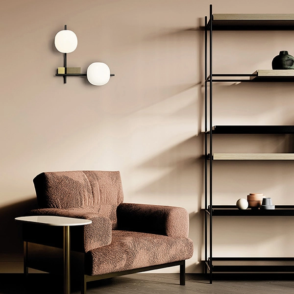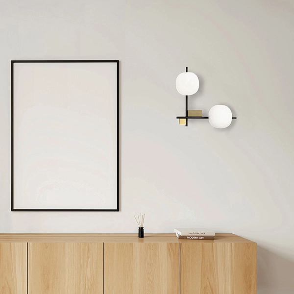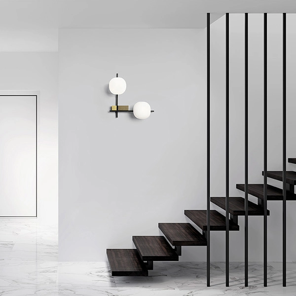 Lampada a parete a 2 luci in metallo nero, con particolari oro spazzolato e oro rosa. Vetri soffiati opalino forma arrotondata. Lingotto è un'applique semplice ma d'effetto. La scelta ideale per chi vuole illuminare le pareti e inserire allo stesso tempo un oggetto d'arredo. Questa soluzione versatile si presta a varie applicazioni in più contesti, dalla casa, agli hotel a negozi/showroom.