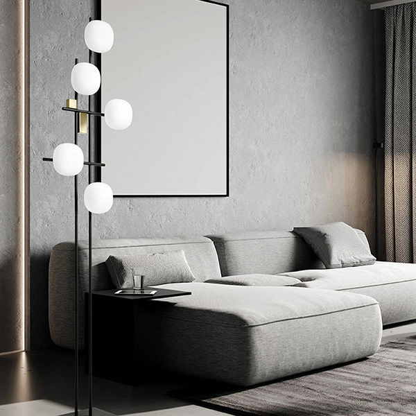 Lingotto è una piantana dallo stile moderno e contemporaneo che impreziosisce ogni ambiente. In soggiorno o all'interno di strutture ricettive, si fa notare per il suo design. Struttura in metallo nero, con particolari oro spazzolato e oro rosa. Vetri soffiati opalino forma arrotondata. Lampada dotata di Dimmer.