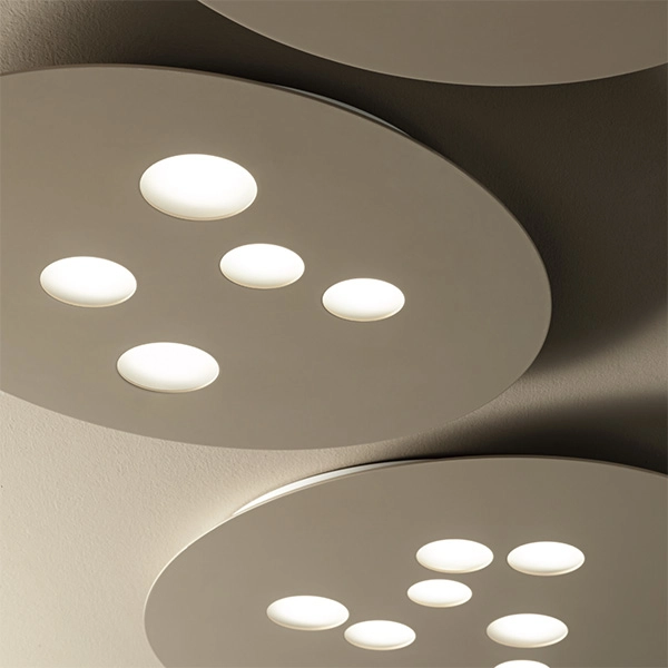 Una plafoniera moderna e di design che si addice a più contesti sia privati sia commerciali e ricettivi. Luna si caratterizza per forme circolari concentriche e superfici levigate. Da sola o in composizione, questo articolo è disponibile in tre varianti dimensione. Montatura in metallo bianco. Diffusore in metacrilato e alluminio con finiture bianco e tortora. Sospensione con luce in biemissione. Lampadine non incluse.