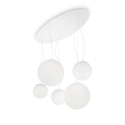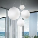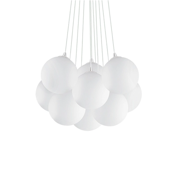 Lampadario dal design minimal e contemporaneo, che s'inserisce alla perfezione in ogni tipo di arredamento. Ideale per il soggiorno, soprattutto se si crea una composizione di luce con le varie dimensioni disponibili creando un effetto scenografico. La montatura è in metallo bianco, il diffusore a sfera in vetro bianco soffiato e acidato; i cavi in acciaio sono a lunghezza regolabile.