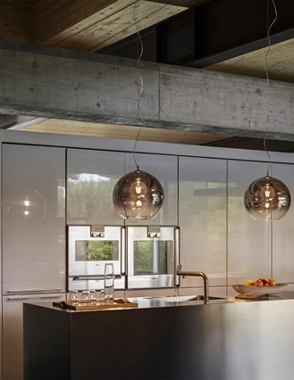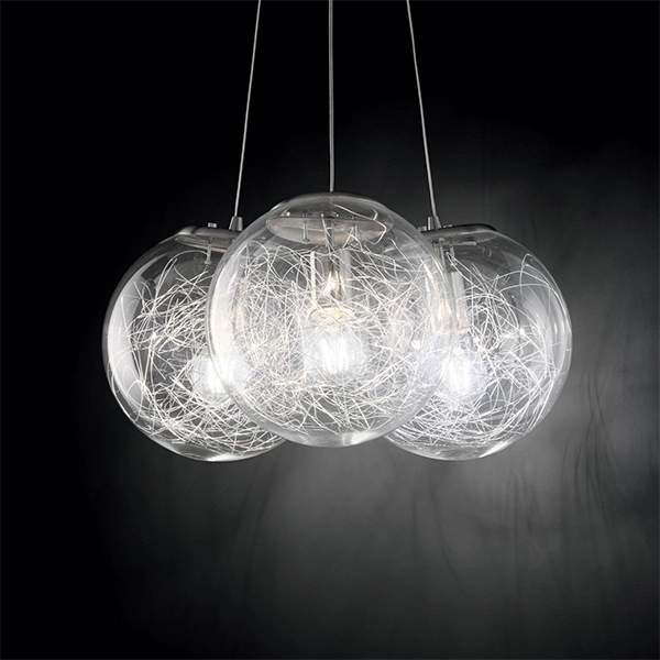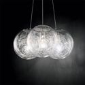 Mapa Sat è una lampada a sospensione che rappresenta un oggetto di design imperdibile nell'arredamento della casa o di strutture alberghiere. La montatura è in metallo con finitura nickel o ottone, mentre il diffusore è in vetro soffiato trasparente con decoro interno in filo d’alluminio.