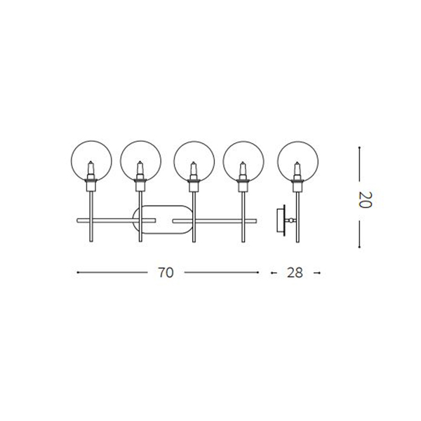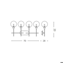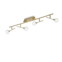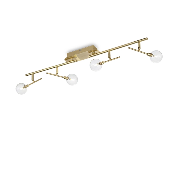 Plafoniera a 4 luci di tendenza che impreziosisce ogni ambiente in cui viene inserita. Perfetta per la zona living e la zona notte. La montatura è interamente in metallo rifinito in ottone satinato. I diffusori orientabili sono in vetro soffiato trasparente.