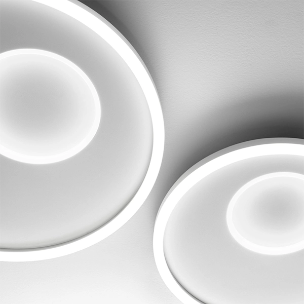 Due circonferenze inscritte l’una nell’altra, Melania rappresenta un’intuizione stilistica in grado di arricchire di significato e stile l’ambiente che la accoglie. Disponibile in tre misure. Montatura in alluminio verniciato bianco. Diffusore in metacrilato satinato bianco. Sorgente luminosa LED. Su richiesta anche versioni a 4000 K.