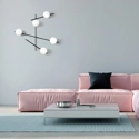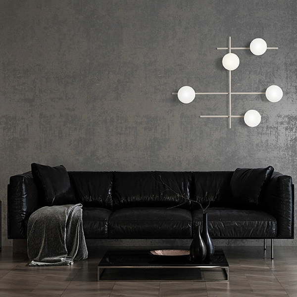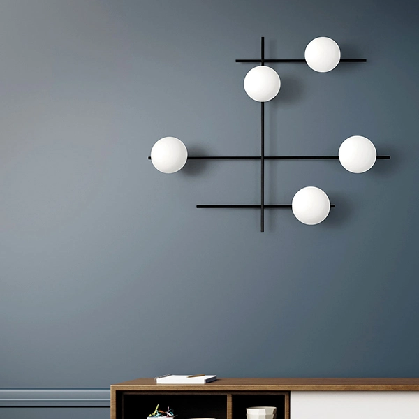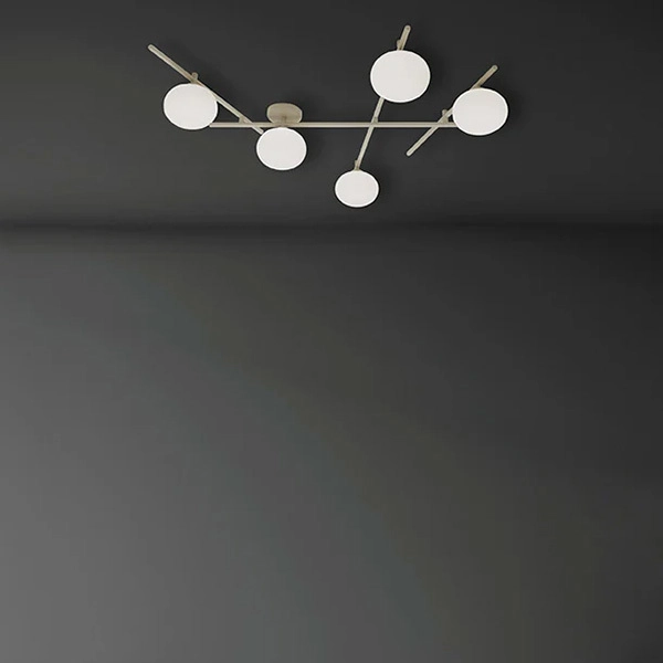 Lampada versatile a cinque luci che può essere utilizzata come applique o plafoniera per illuminare arredamenti moderni di case, strutture ricettive, locali e ristoranti. La montatura è in metallo verniciato a polvere nero soft touch o cipria opaco, il diffusore è in vetro soffiato bianco latte con diametro 14 cm. La rotazione del braccio secondario permette di scegliere la posizione preferita.