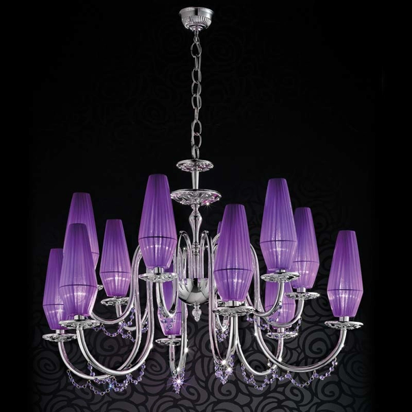 Lampadario a 12L, realizzata da Bellart, struttura in metallo e diffusori organza, bobeches in vetro cromato con pendenti Sw