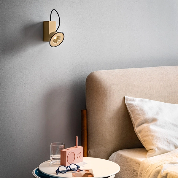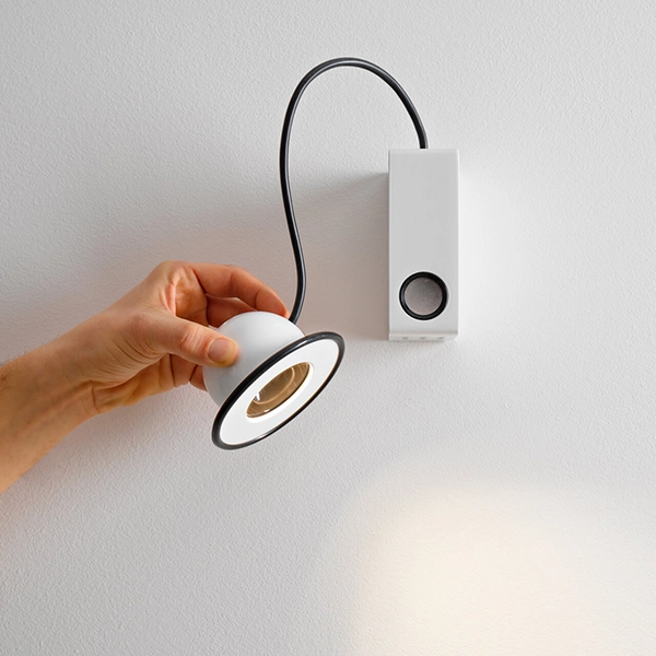 Minibox applique da parete è composta da un corpo in metallo e un irriverente occhio luminoso. L’aggancio magnetico della testa permette di orientare la luce, rendendola adatta ad ogni luogo. Design di Gae Aulenti e Piero Castiglioni. Corpo in metallo verniciato nelle finiture lucide bianco, nero, caffè, verde, rosso. Testa orientabile in metallo con aggancio magnetico, sorgente topLED.