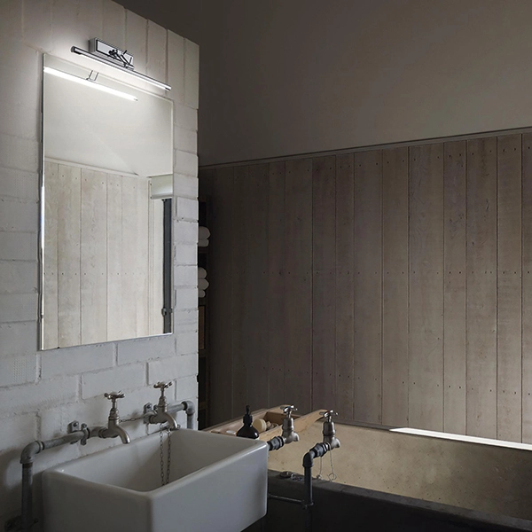 Applique perfetta per essere posizionata sopra lo specchio. Illumina con stile il bagno della casa o di una camera da letto in hotel. La montatura è in metallo con finitura cromo. Diffusore posizionabile.