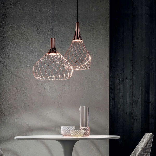 Raffinata leggerezza di linee avvolgenti. Questa sospensione unica nel suo stile è ideale per illuminare un ambiente living o un tavolo da pranzo ma s'inserisce perfettamente anche all'interno di hotel e ristoranti. È disponibile in metallo verniciato nero oppure con finitura oro rosa e nickel nero. Grazie alla tecnologia di dimmerazione Warm TuneTM la luce che scaturisce dalla sorgente LED varia contemporaneamente in intensità e temperatura colore, seguendo le esigenze ambientali.