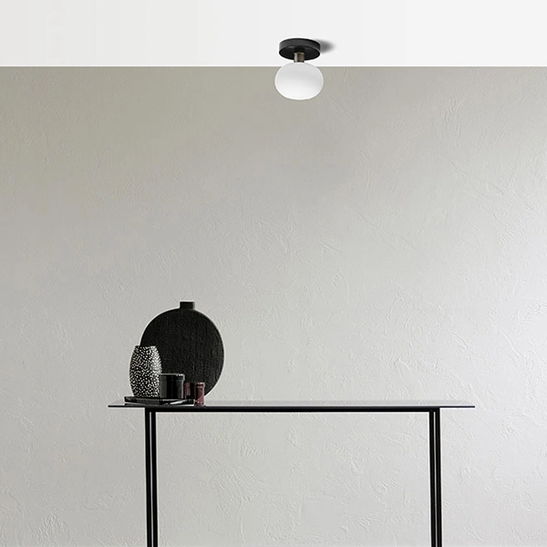 In questa versione da parete o soffitto, Mose si fa riconoscere per linee moderne e di design. Crea una luce funzionale e decorativa in vari ambienti della casa o di strutture ricettive. Realizzata in vetro soffiato bianco latte, questa soluzione si caratterizza per una montatura in metallo verniciato nero soft touch, con particolari in oro, rame o bronzo spazzolato. Design di Davide Negri.