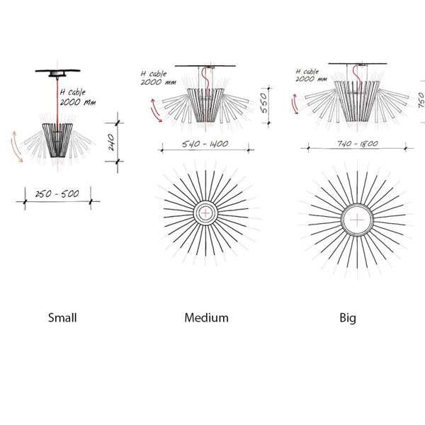 La struttura è in MDF e alluminio, il cavo elettrico è disponibile in silicone, in tessuto nero o rosso.