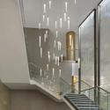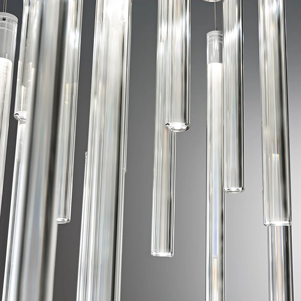 Lampadario di design perfetto per creare interessanti composizioni di luce. S'inserisce nei vari ambienti della casa e di hotel. Il diffusore è in vetro borosilicato trasparente con cilindro interno in materiale plastico. La montatura è in alluminio anodizzato e il rosone in metallo verniciato bianco. Il lampadario è già cablato e contiente un LED e il driver elettronico dimmerabile, estremamente comodo e funzionale.