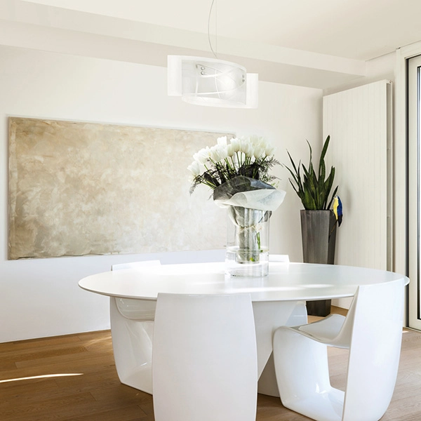 Il dolce intreccio di decori ornamentali caratterizza questa sospensione elegante e raffinata. Ideale per illuminare la zona living della casa, Nereide è versatile e illumina in modo funzionale. Montatura in metallo, particolari in cromo. Diffusore in vetro serigrafato bianco. Finitura satinata.