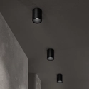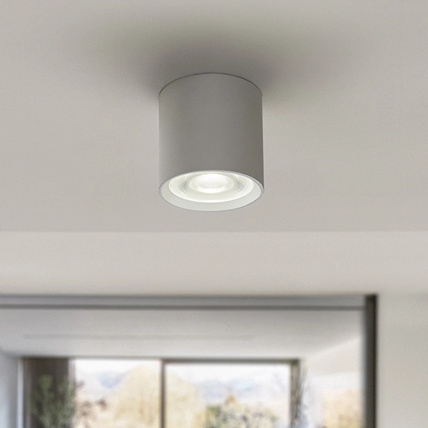 Plafoniera moderna e minimal con un corpo luce in alluminio verniciato bianco o nero opachi. L'interno è rifinito con mascherina in plastica. Sorgente luminosa a led integrato con lente. Driver incluso ON/OFF. Articolo ideale per forniture contract.