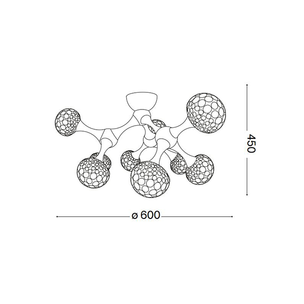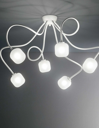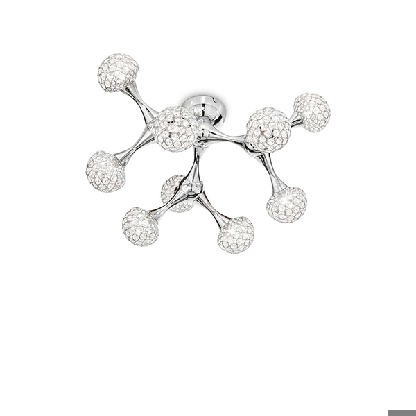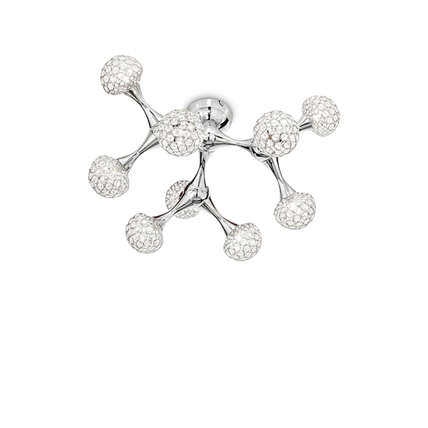Una plafoniera preziosa e con un stile unico, Nodi crystal è una lampada da soffitto a 9 luci con montatura in metallo cromato. I diffusori sono composti da anelli in metallo cromato con ottagoni di cristallo incastonati all'interno. Lampadine alogene G9 28W 2700 K incluse.
