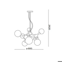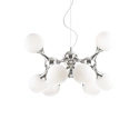 Elegante e raffinata lampada a sospensione a 9 luci con montatura in metallo cromato oppure in ottone satinato. I diffusori sono in vetro bianco soffiato, acidato o trasparente e cromato. Adatta ad illuminare ambienti arredati con uno stile moderno e contemporaneo.