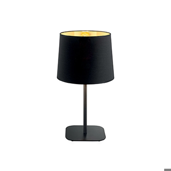Lampada da tavolo elegante con paralume in lamina di PVC dorato rivestito in tessuto nero.