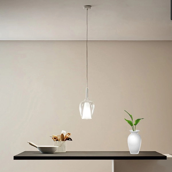Forme essenziali caratterizzate dalla lavorazione di due tipi di vetro che si avvolgono e ricoprono. Ofelia S10 ha un design innovativo che piace per originalità e tecnica realizzativa. All'interno c'è un vetro satinato che diffonde omogeneamente la luce, protetto e rivestito da un secondo vetro trasparente, colorato trasparente o con finitura specchio. Il vetro è borosilicato con portalampade E27 bianco e cavo in PVC trasparente lunghezza 3 metri.