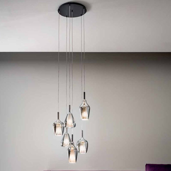 In questa versione Ofelia è una sospensione di sei luci con vetri in cromo specchiato. Un elemento di design che illumina ogni ambiente. Altezze regolabili e personalizzabili a seconda delle esigenze. Lampadine non incluse.