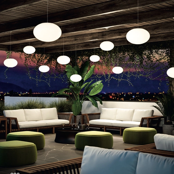 Oh! Smash nella versione a sospensione è una soluzione moderna adatta a diversi contesti esterni come portici e gazebi grazie all'elevata protezione contro polveri e schizzi d’acqua. Il diffusore, globo luminoso in polietilene bianco, fluttua dal cavo sorretto da una base in metallo verniciato bianco opaco o in polietilene bianco. All'interno trova posto una sorgente LED integrata o, in alternativa, l'attacco E27.