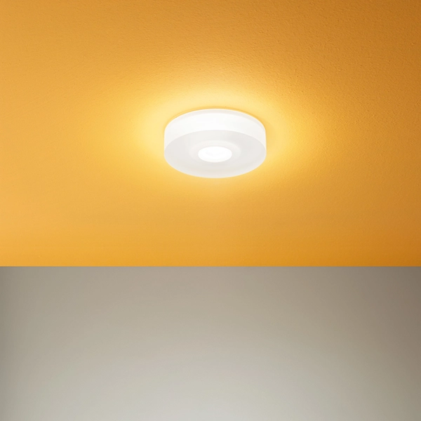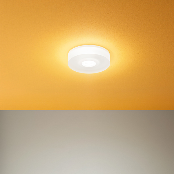 Plafoniera essenziale a forma di disco luminoso che s'inserisce alla perfezione in ambienti residenziali