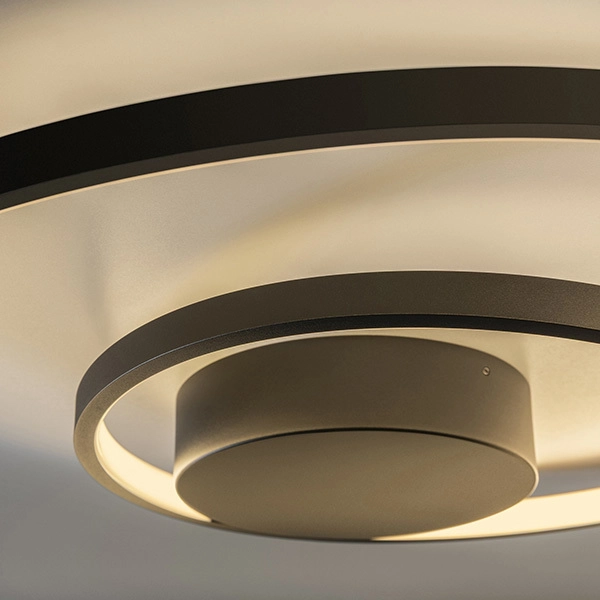 Oz è una plafoniera moderna che illumina alla perfezione zone living, cucine e camere da letto. Grazie allo stile e alla forma di design, Oz si presta anche ad applicazioni in contesti commerciali e ricettivi. Disponibile in tre finiture: bianco, nero e ottone spazzolato e in diverse misure. Base e montatura sono in metallo verniciato a polveri o placcato. Diffusore in gomma opale. Sorgente luminosa LED 3000 K, 30.000 h di durata.