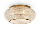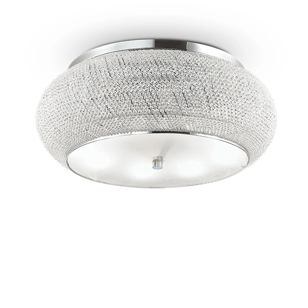 Pashà è una plafoniera in cristallo che illumina con classe sia zone living che zone notte di case arredate con stile classico. Può essere collocata anche in strutture ricettive che cercano un'illuminazione ricercata. La montatura è in metallo, mentre il diffusore è composto da filari di perle in cristallo molato e fondo chiuso da vetro circolare sabbiato. Disponibile nelle due finiture preziose: oro e cromo.